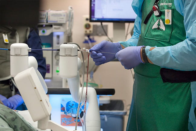 Nick Pastis, M.D., threads a bronchoscope into a patient’s lung. He will use a joystick to maneuver the bronchoscope to the exact position of a lung nodule.