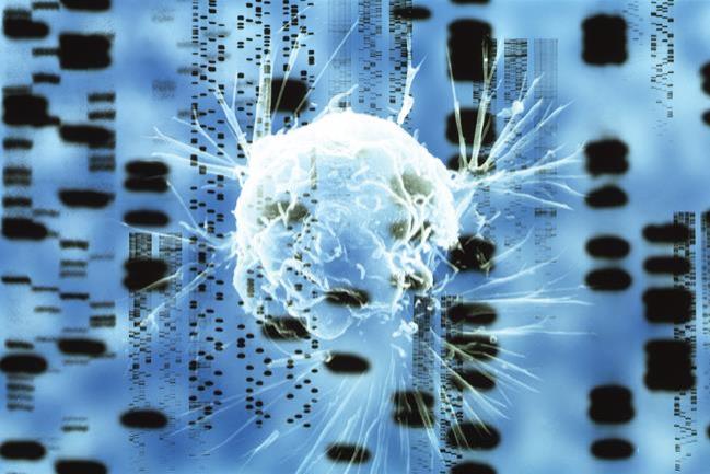 Illustration of cancer cell (white) and the genetic code of a section of DNA
