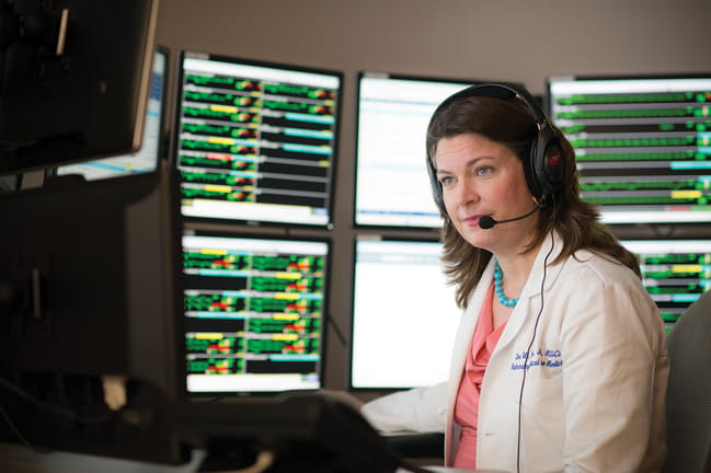 Critical care administrators at MUSC Health have had a longstanding interest in supporting ICU needs across the state, even prior to the 2013 telehealth funding from the South Carolina legislature, explains Dee Ford, M.D., MUSC Health Tele-ICU director. “With this operations center and our interprofessional team education program, hospitals can be certain that patients’ needs are being matched to the level of care they need,” she says. “We believe that this will benefit community hospitals because ICU care is complex and costly.”